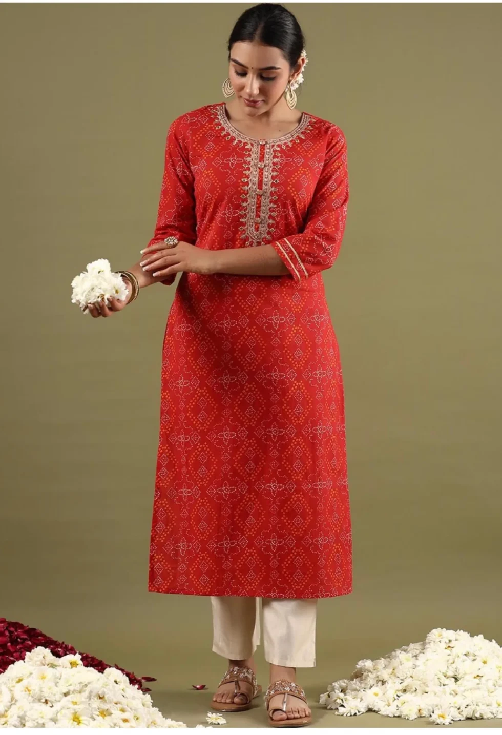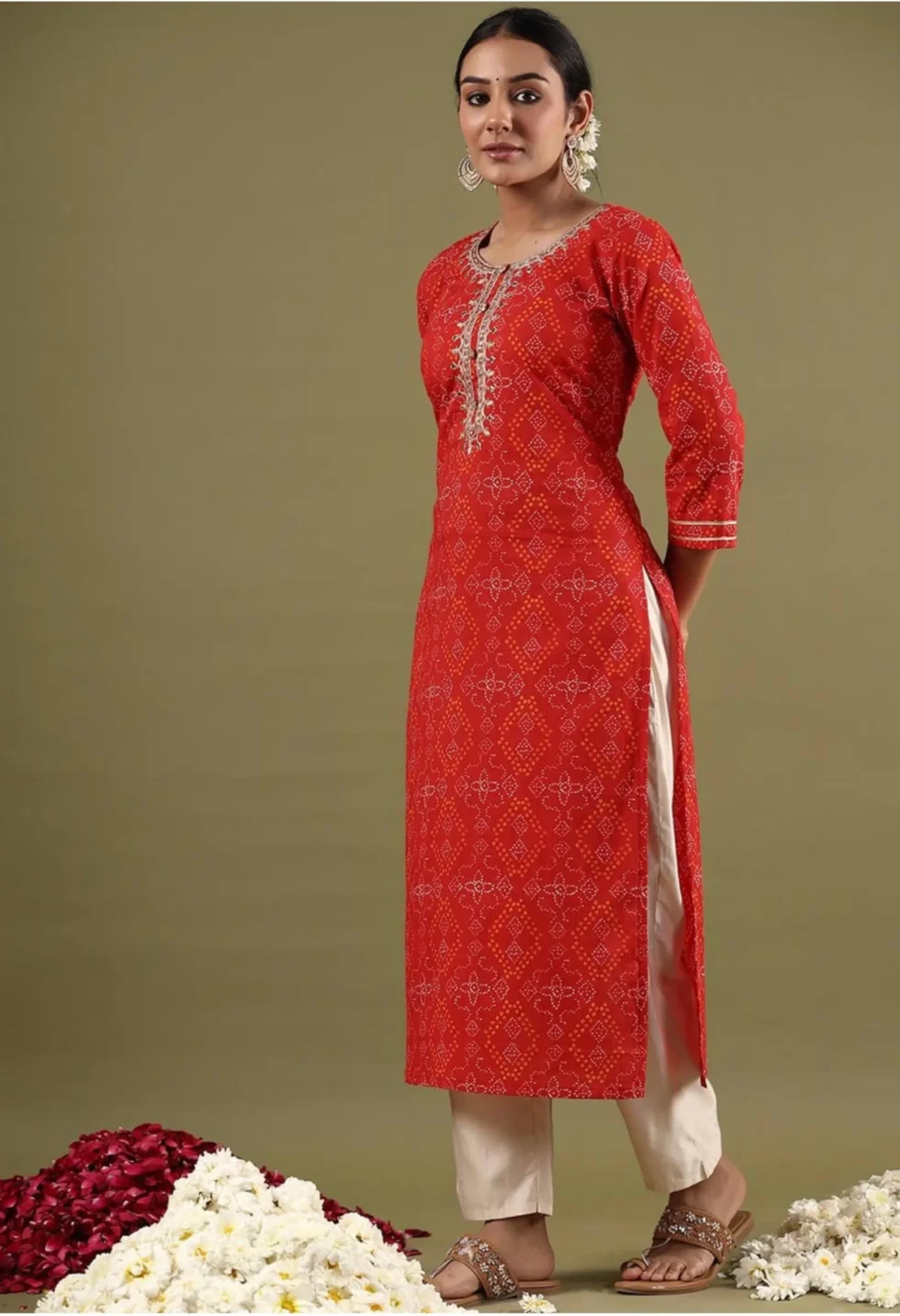 Introducing the Memsaab Red Floral Printed Cotton Kurta, a vibrant piece perfect for both casual and festive occasions. This beautiful kurta features a straight-cut design made from regular cotton fabric, adorned with a bright floral print. The kurta has a round neck, long sleeves, and falls above the knee with a straight hem. Designed with delicate thread work details, this kurta combines comfort with style.