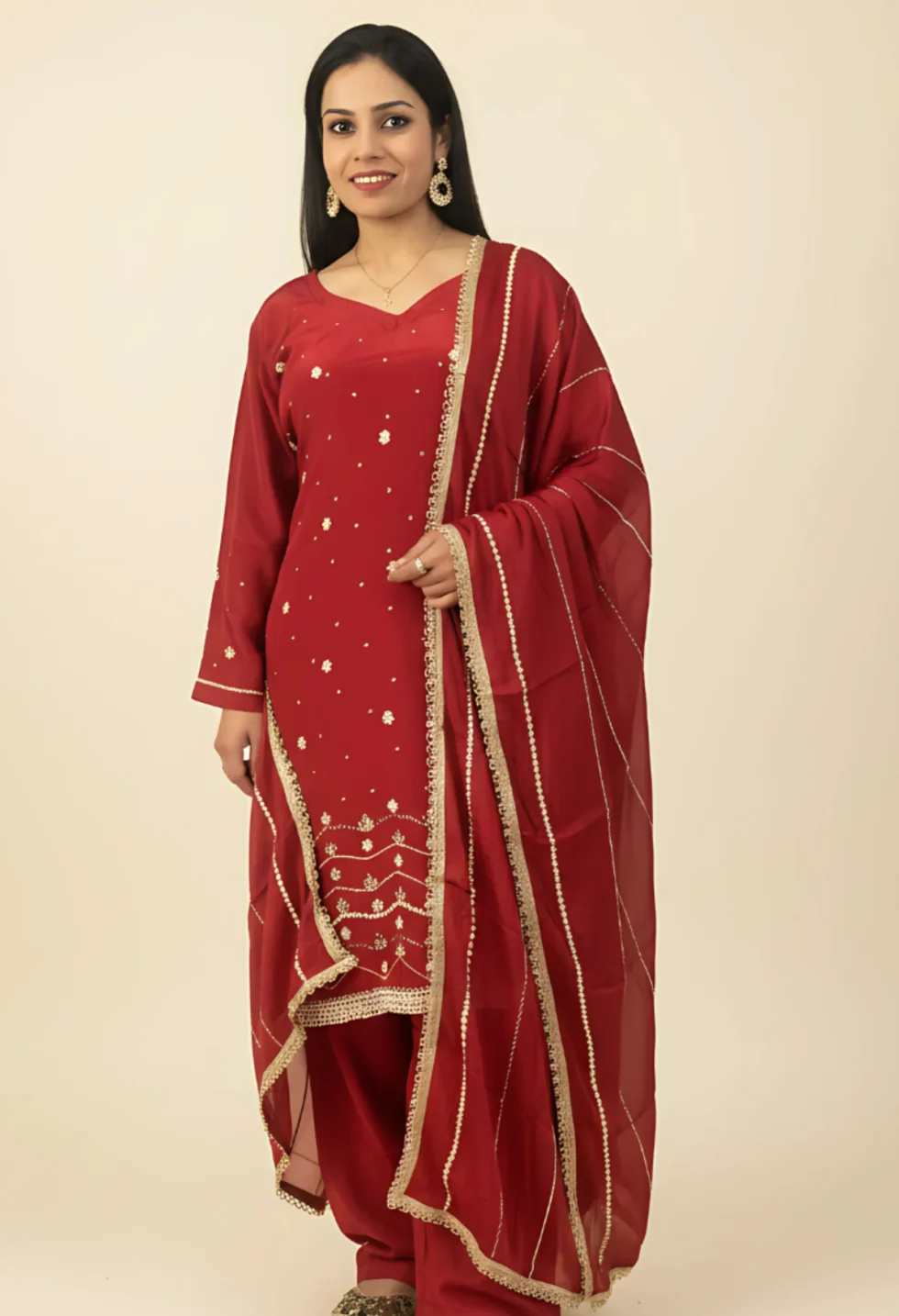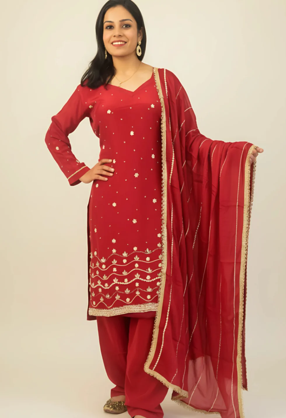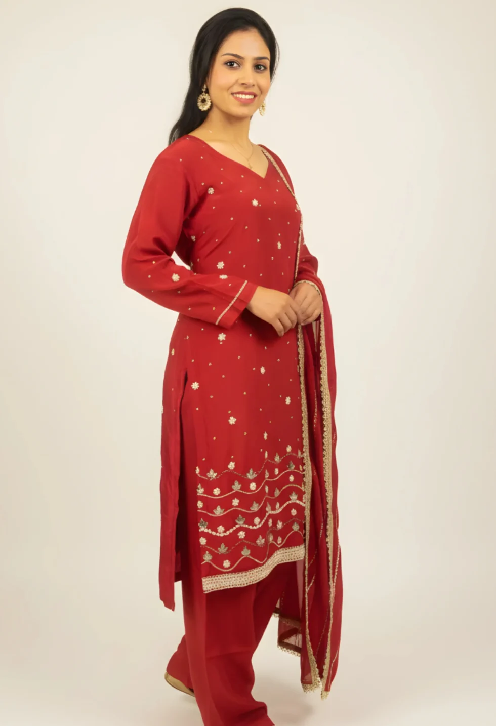 Memsaab Red Handwork Embroidered Kurta Palazzo Set with chiffon dupatta — heavy hand embroidery, smart neckline, and crape fabric with lining.