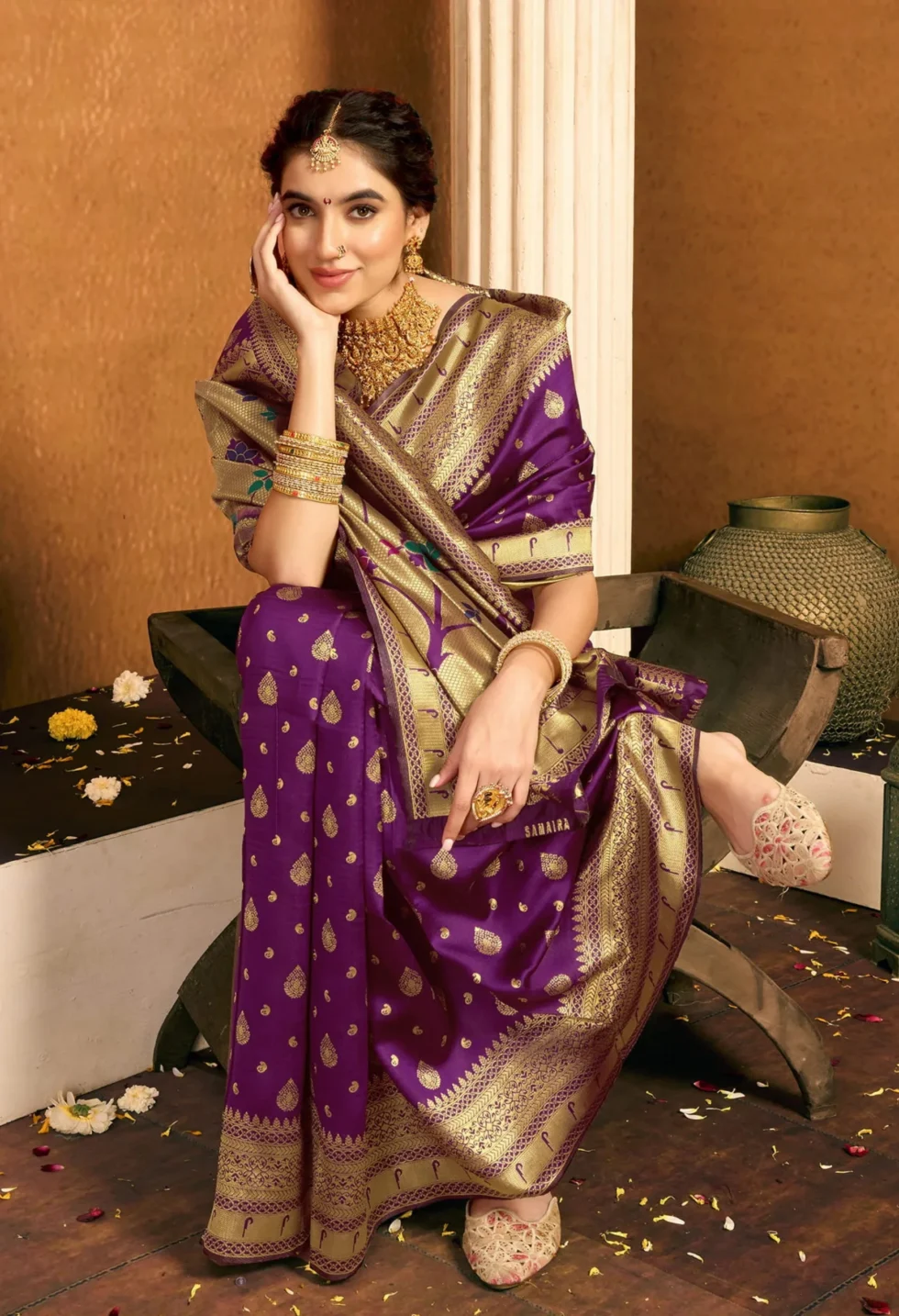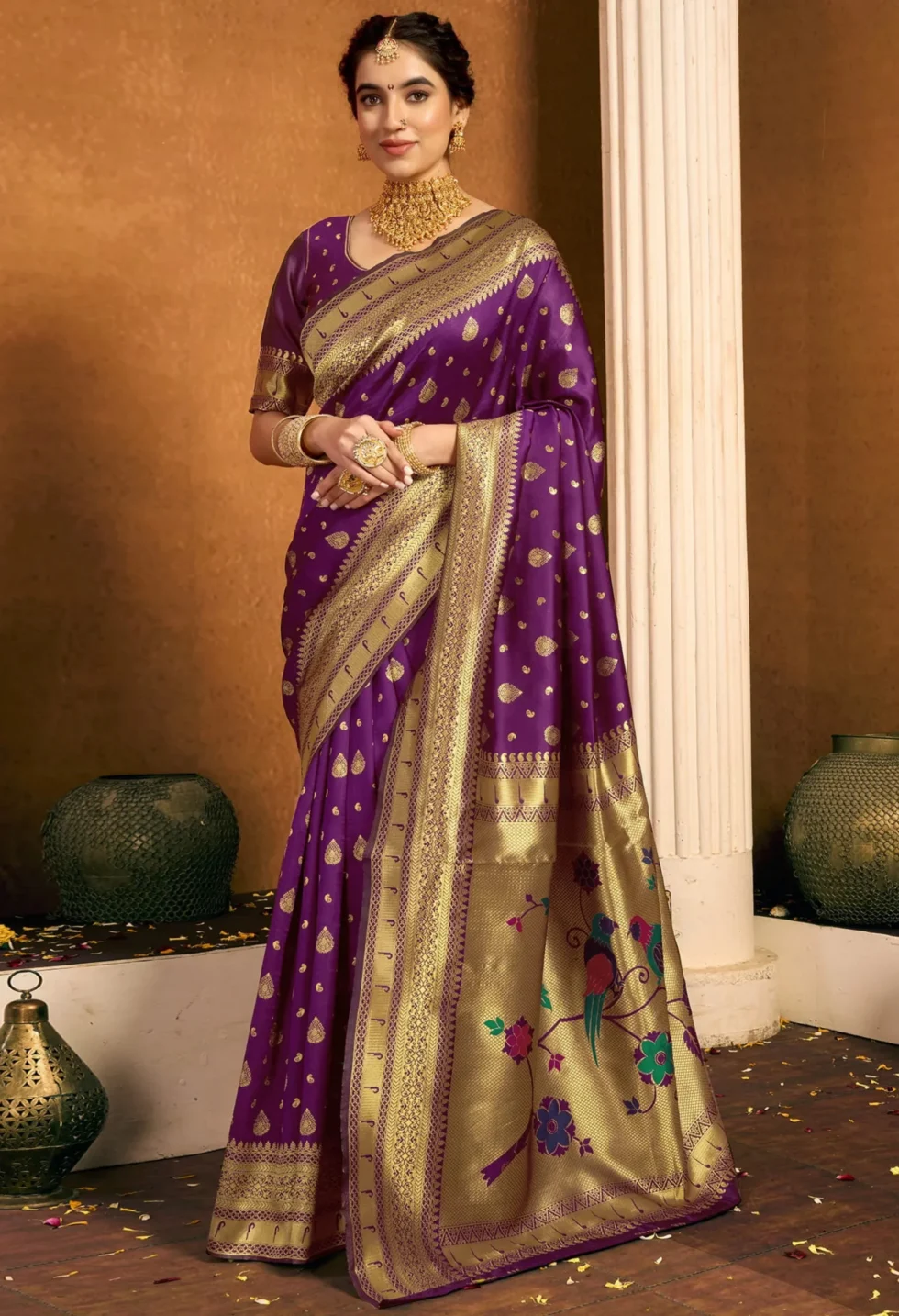 This purple silk Paithani saree features exquisite woven artistry with a traditional multicoloured touch. Includes an unstitched silk blouse—ideal for festive and formal wear.