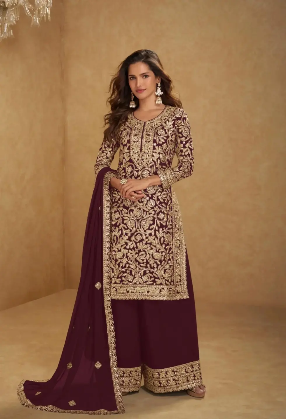 A regal wine chinon sharara set featuring heavy embroidery and a grand festive silhouette.