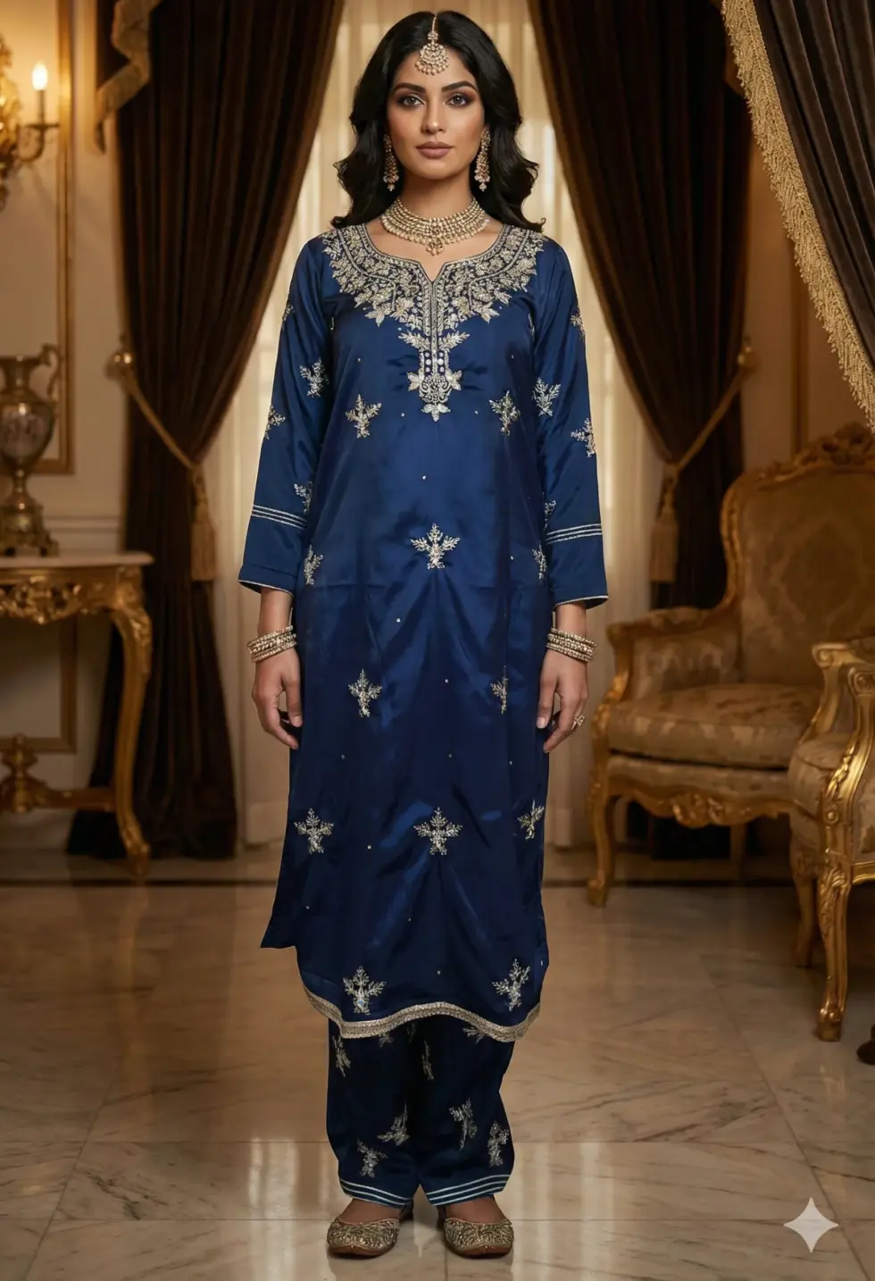 A royal navy silk blend kurta set enriched with intricate embroidery and paired with coordinated bottoms and a floral statement dupatta.