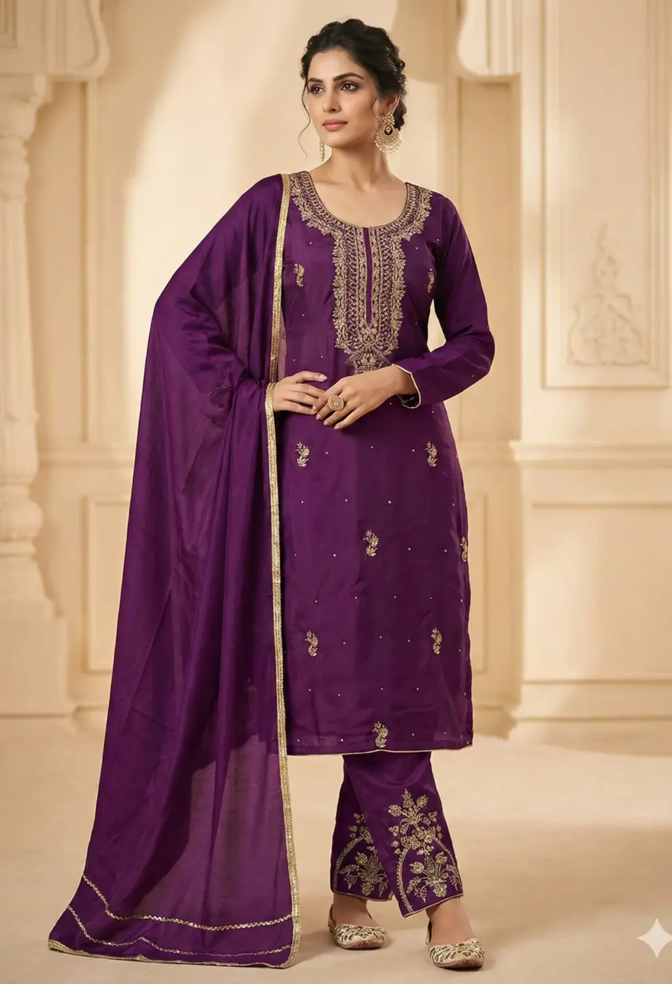 A luxurious royal purple kurta set adorned with intricate zari embroidery, paired with embroidered trousers and a flowing dupatta for timeless festive elegance.