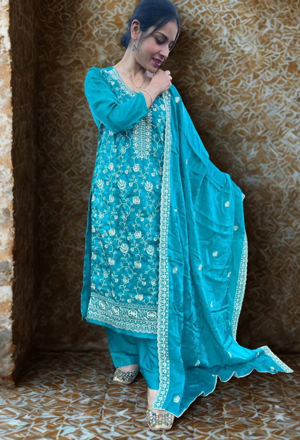 Embody luxurious and traditional style with the Memsaab Royal Rama Green Silk Palazzo Suit, where every detail reflects artisanal excellence.
