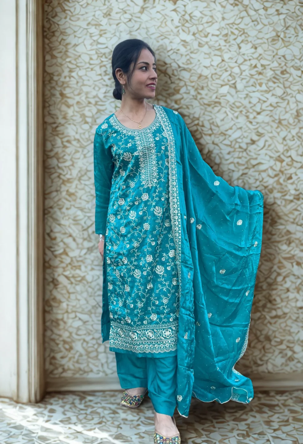 Feel the emotional connection to Indian traditions with every wear—the rama green silk palazzo suit isn’t just attire; it’s a celebration of culture and craftsmanship. Perfect for festive events or gifting to loved ones.