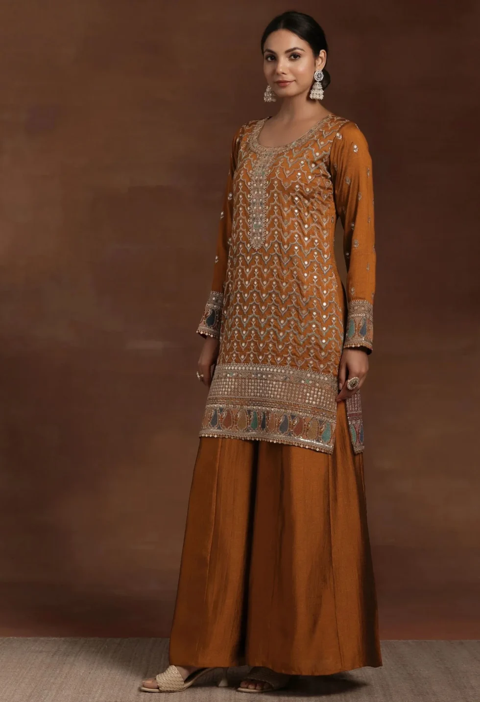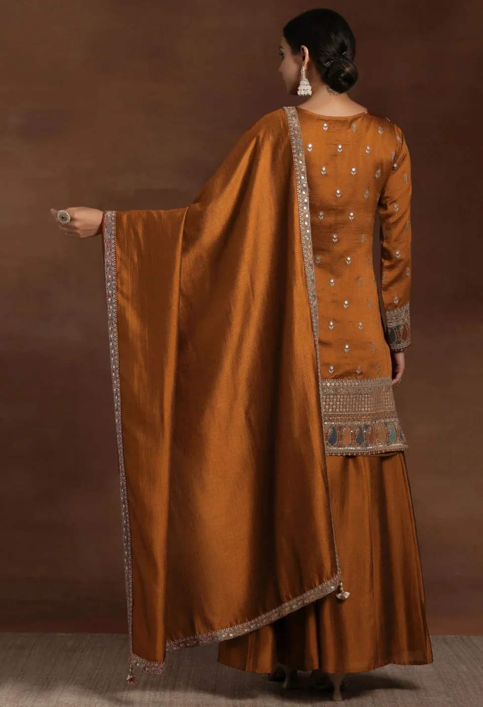 • Style: This Memsaab Rust Embroidered Kurta Sharara Set combines cultural elegance with festive charm