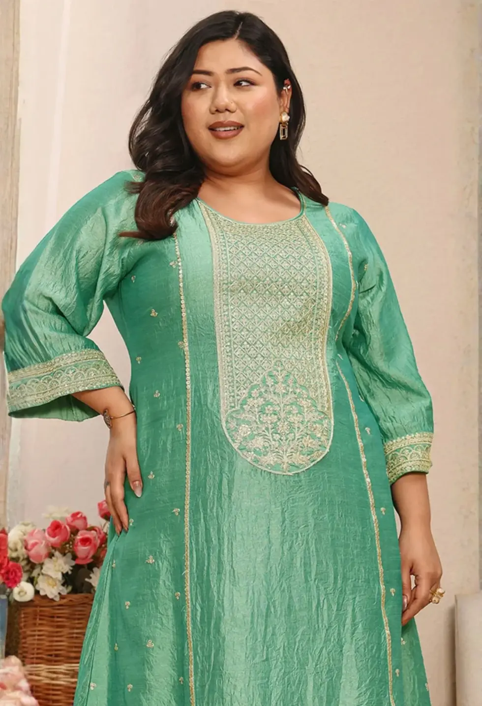 Elegant sea green kurta set with graceful panelled styling and embroidery.