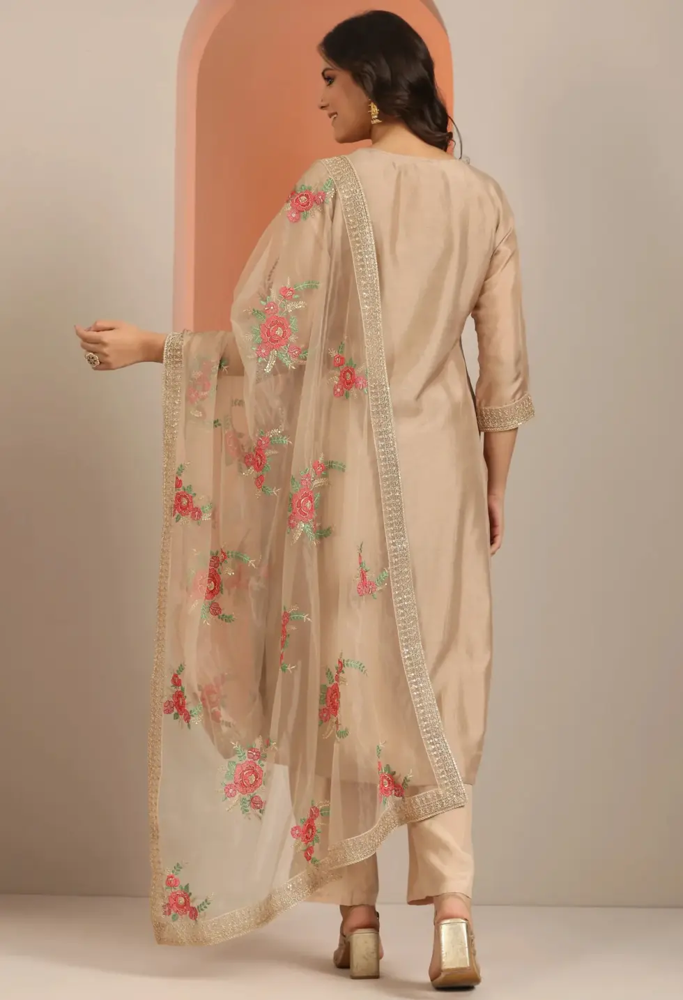 Graceful tan silk blend kurta set featuring floral woven detailing and an embroidered dupatta.