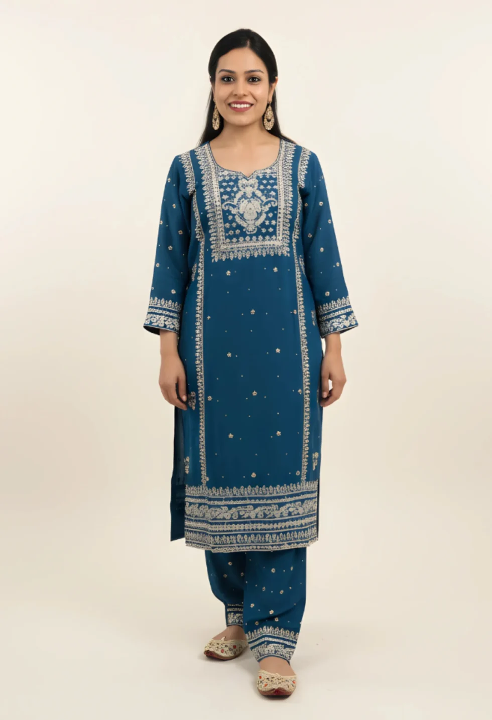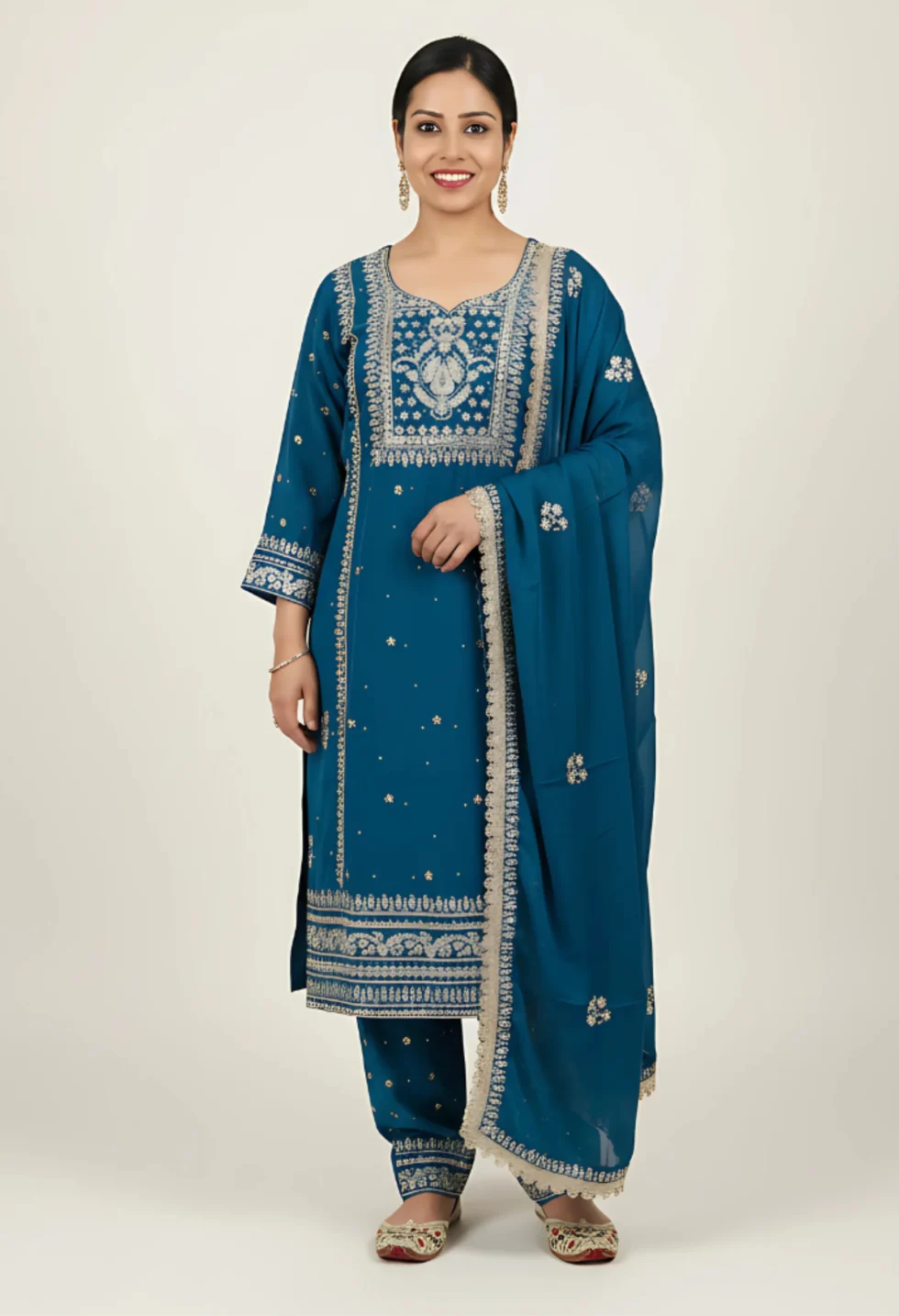 Memsaab Teal Handwork Embroidered Kurta Palazzo Set with chiffon dupatta — heavy hand embroidery, smart neckline, and crape fabric with lining.