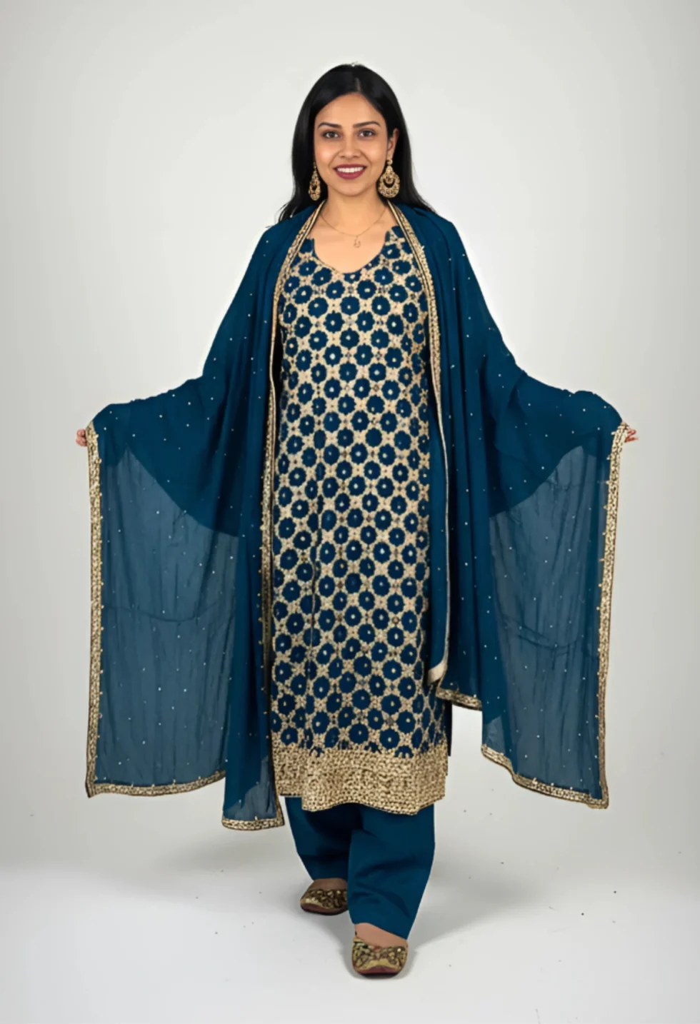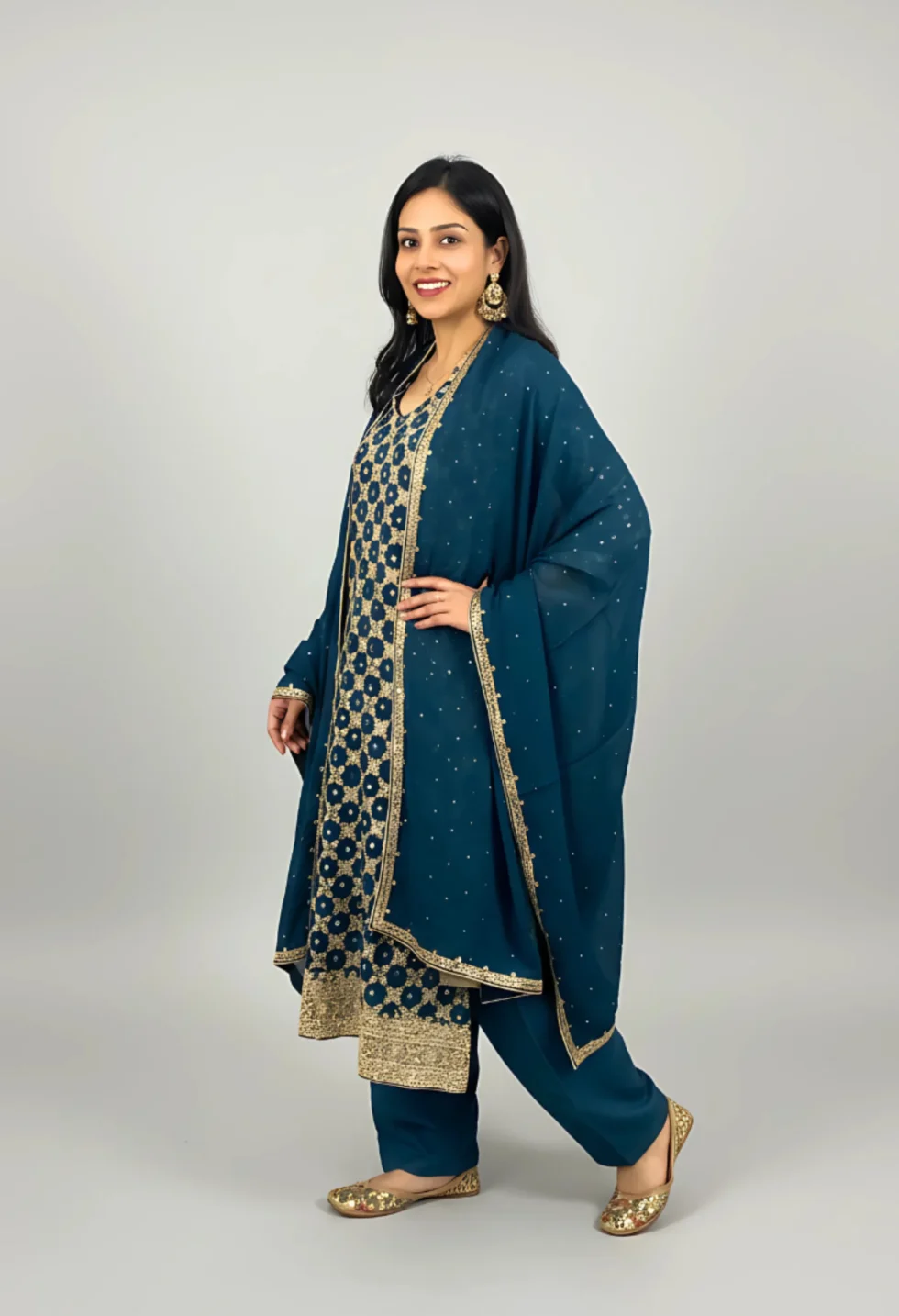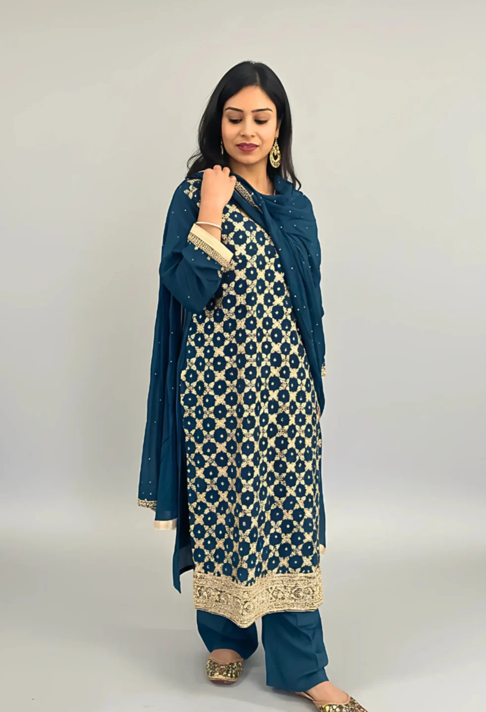 Memsaab Teal Jaal Handwork Embroidered Kurta Palazzo Set with brocade dupatta — heavy jaal embroidery, stonework detailing, and crape fabric with lining.