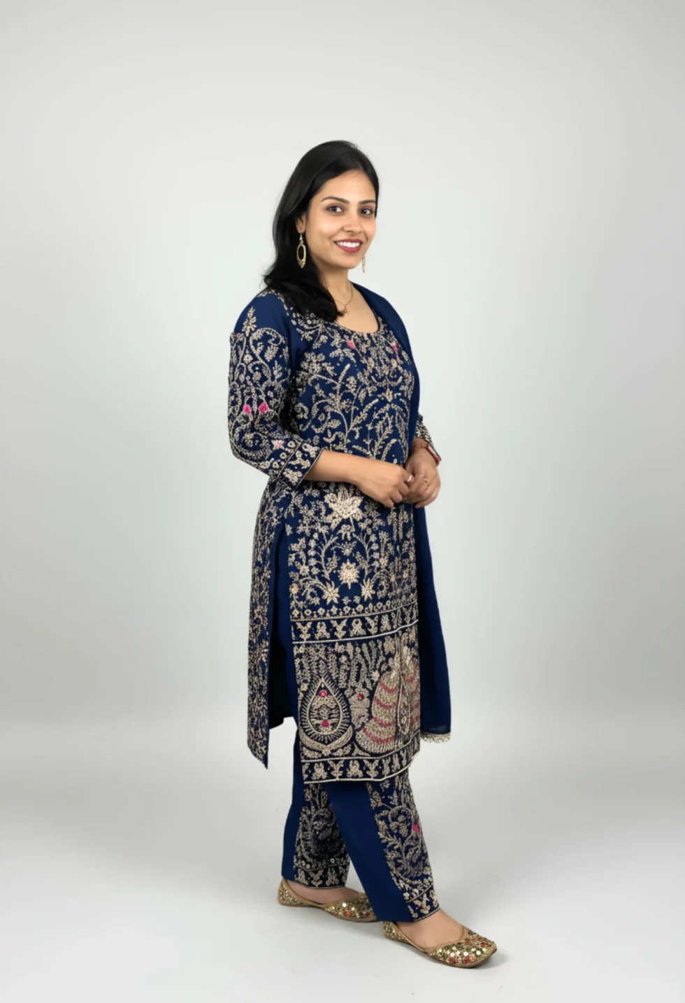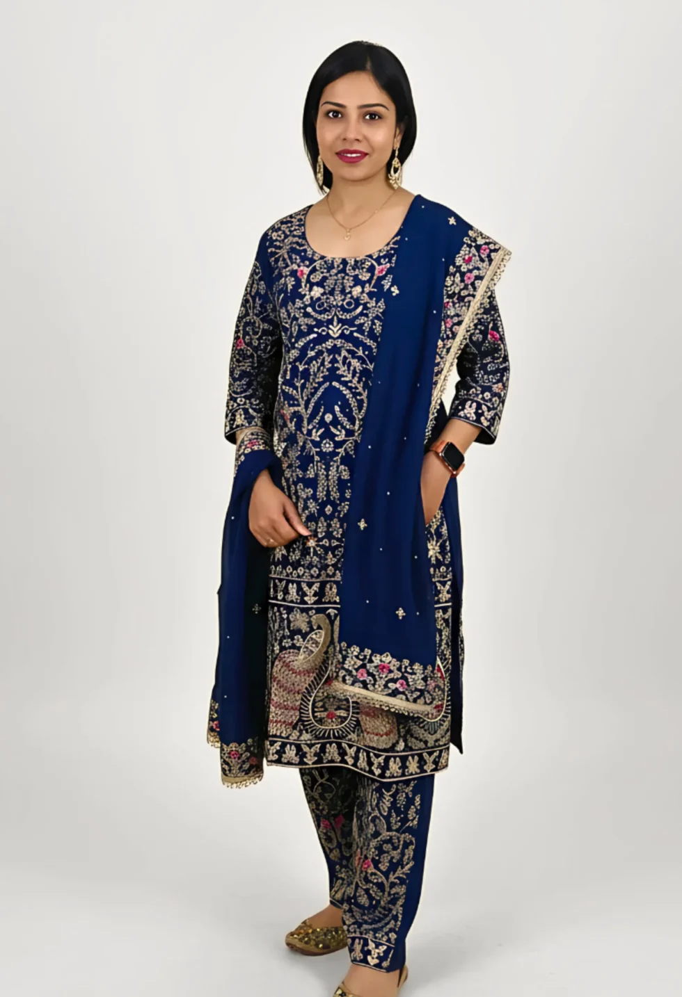 Memsaab Teal Peacock Handwork Embroidered Kurta Palazzo Set with brocade dupatta — peacock hand embroidery, stonework detail, and crape fabric with lining.