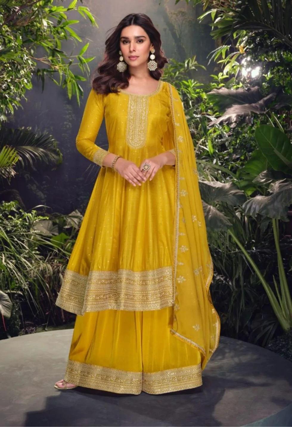 Memsaab Yellow Silk Embroidered Sharara Set for Women with full embroidery on kurta, palazzo, and dupatta — a regal choice for weddings and festive celebrations.